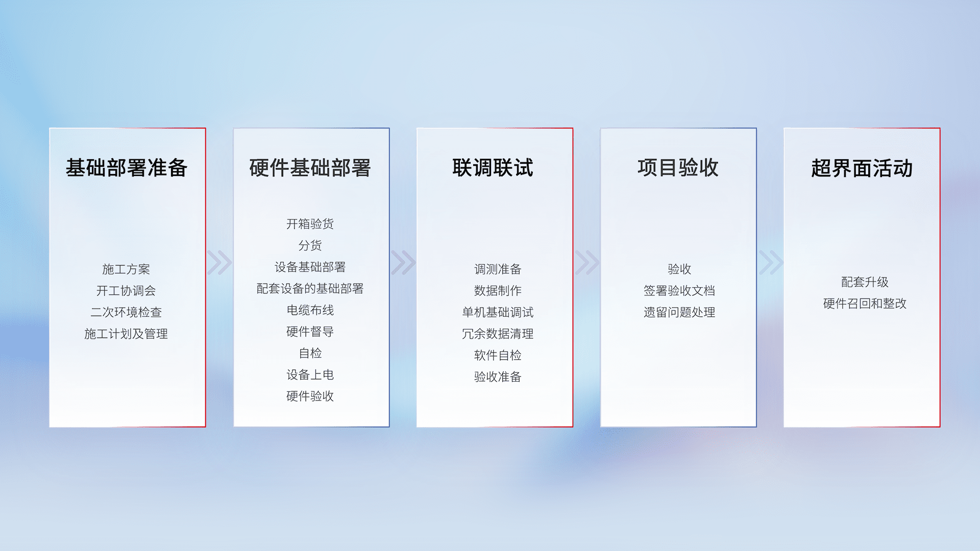 从基础部署准备、、、硬件基础部署、、联调联试、、项目验收、、越界面活动的全过程可追溯,,,保证施工质量和进度。。